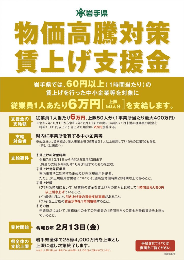 岩手県では、最低賃金の大幅な上昇が続く中、中小企業等が継続的に賃上げできる環境を整え、必要な人材を確保していくため、「物価高騰対策賃上げ支援事業」を実施いたします。